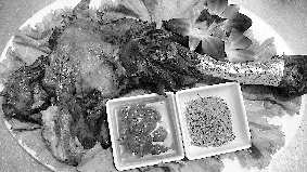 秘制烤羊腿 秘制烤羊腿也是比较值得推荐的菜品,据主厨任师傅介绍羊腿的制作过程是这样的:将羊腿卤熟之后(大约需要1.5个小时),撕成块状,放入烤炉烤熟(15分钟左右)重点就在这里了,在放入烤炉之前要在羊腿上刷独家秘制的酱料,这样烘烤出来的羊腿口感好,羊肉的膻味淡,外焦里嫩的,吃起来很诱人。