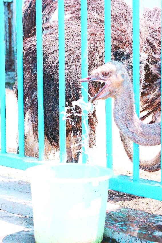 刚一进动物园,记者就看到几只鸵鸟正从笼舍里伸出脖子饮水,有几只鸵鸟的翅膀成张开状,并不时拍打,动物园的管理人员姜殿飞说这是它解暑的独特方式,鸵鸟的翅膀是它与严寒和酷暑作斗争的武器,夏天拍打翅膀即可以解暑。“孔雀开屏了。”随着一声喊,游客们聚集在了孔雀的笼舍前,“为什么羽毛这么少呢?”一位游客发出了这样的疑问。“天气一热,孔雀会自己脱掉羽毛。”工作人员介绍,除了孔雀很多有毛发的动物都会换上相对稀疏的毛发度夏。等到秋天时,它们又会长出新毛发,迎接冬天。高温之下,人们都觉得穿得越少越凉快,动物园里的很多动物们也都热得脱掉了厚厚的毛发。