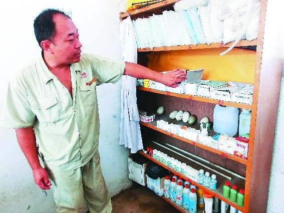3、工作人员向记者展示用于帮动物度夏的药品,降温用的藿香正气水,清洁用的消毒液都是必备的。