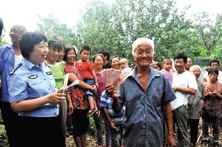 8日上午,东昌府公安分局在城区湖西大集上举行返还被盗抢财物现场会,来自济南、河南及全市的上百受害人参加。东昌府公安分局现场返还被盗抢现金244730元及大批物品。图为81岁的冯汝堂拿到返款后高兴地笑了起来。
