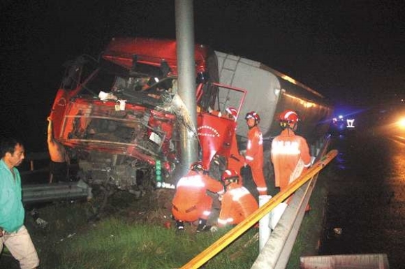 8月6日23时53分,青银高速高唐县出口处发生一起交通事故,一辆载满柴油的罐车撞上路旁指示路牌钢柱,驾驶员被卡住无法动弹。高唐县公安消防大队官兵用液压顶杠对破损车门进行破拆,约40分钟后成功救出被困人员。本报通讯员 李兵 孙成光 摄