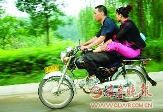 自述:在急驶的摩托车上,女士将双腿盘在男士身上。