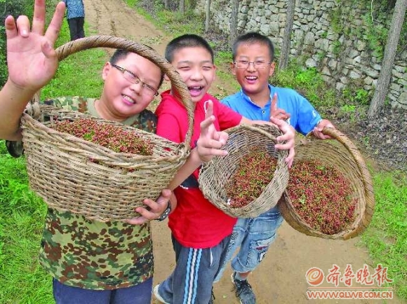 12日,长清区孝里镇马岭村,本报张刚大篷车组织前去体验农活的孩子们在采摘花椒后,享受丰收的喜悦。虽然摘花椒时孩子们手上扎了刺,受了点苦,可采摘这么多花椒,让他们感到非常高兴。