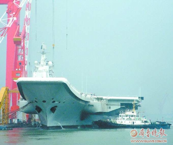 14日中午,中国首艘航母平台被拖船拖至大连造船厂,航母拉响三声汽笛,随即造船厂内响起鞭炮声。在航母原来停靠地,一台吊车将一个大型条幅挂起来,上面写着“热烈欢迎首航试验凯旋归来”。