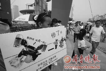 14日,青岛双山学校的学生举着杜绝酒驾的漫画向市民宣传,提醒来啤酒城的市民勿酒后驾车。