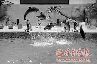 齐河极地海洋世界开门纳客半个多月,迎来暑期游客高峰期,孩子和家长成为前来游玩的主力。图为海豚表演现场高潮迭起。