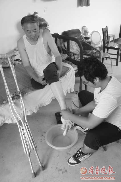 王海的父亲拄着双拐,右腿已经截肢,因为行动不便,14日,王海将父亲接到家里帮他洗澡。在和王海父亲的交谈中,他向记者倾诉了这几年家里的变故。