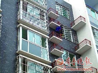 11日下午6时15分,在接到李女士的电话后,记者迅速来到名仕雅居小区9号楼,只见很多居民抬着头向上看,记者顺着居民们目光注视的方向看去,一位男子正站在5楼的空调架上,看他的样子是上也不行,下也不行。