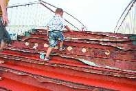 本报8月14日讯(见习记者 于荣花 王晓霜) 彩虹桥阶梯踏布张裂,内侧的铁皮不光生锈难看,而且还经常“咬”住游客的脚。