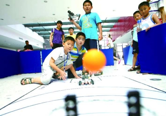 操作机器人用乒乓球投篮,你行吗?14日,来自东营、淄博、滨州、烟台的60余名小选手,参加了在烟台市青少年宫二楼大厅举办的山东省四地市少儿机器人邀请赛。邀请赛分设“百步穿杨”、“百发百中”、“反恐排爆”、“投篮比赛”四个大项。参赛选手最大的12岁,最小的7岁,都有丰富的实战经验。最终,烟台选手获得了24枚金牌中的8枚。