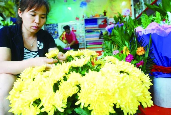 13日,在东城一鲜花店内,店主正在整理待售的菊花。农历七月十五是中元节,也是中国传统祭祖的四大节日之一,每到这一时间,人们便会焚烧纸钱、摆放菊花寄托对先人的追思。 本报记者 任小杰 摄影报道
