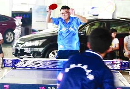 8月13日,第三站东风标致临沂睿狮4S店的比赛虽然远在义堂镇举行,但还是有24名乒乓球爱好者从四面八方远道而来。由于本场比赛报名参赛的选手为24人,三轮比赛下来,前三名选手就已经产生,但他们之前的名次不好排列,最终只能在三个人当中用打循环赛的方式分出冠亚季军。三轮循环赛中三名选手的实力可谓旗鼓相当,几乎每局比赛基本上都是到了8平之后才分出胜负。最终,曾在北京队打过专业的房辉实力稍胜一筹,连赢两场获得了冠军,并获得了由东风标致临沂睿狮4S店所提供的一辆价值518元的限量版标志508车模。