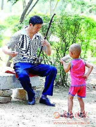 自述:公园里,小男孩对二胡产生了兴趣。