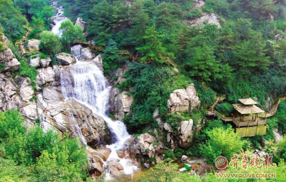 雨后的九如山清新雅致,瀑布飞流而下,撞在岩石的棱角上,如飞花溅玉般散开来,溅起的水花晶莹而多芒,似白梅般纷纷落下,异常壮观。