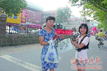 近日,济南市文化东路小学三年级学生李宸乐(右)等同学利用假期卖报纸参加社会实践。