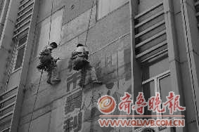 14日起,四方城管执法部门请来“蜘蛛人”对一些清除难度比较大的高楼楼体广告进行了清除,16日下午清理完毕,总面积达到800余平方米。 本报记者 张杰 本报通讯员 姜海龙 摄影报道