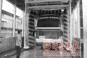 16日,在青岛长途汽车站,市内最大大型客车洗车场投入运营。洗车中心采用全程电脑控制,可以清洗包括双层大客车和双层巴士观光车在内的现有大客车型,一辆大型客车驶入洗车中心仅需5分钟就能完成洗车。本报记者 赵波 本报通讯员 李男摄影报道