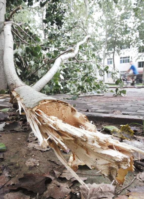 16日凌晨,雷雨大风,聊大东校区4棵大树被刮倒、折断。本报记者 李军摄