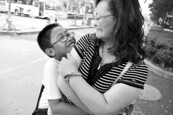 16日,小选手王立冕的妈妈看到儿子卖报非常努力,不禁流下眼泪。王立冕抱住妈妈逗她开心。