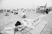 16日,在烟台第一海水浴场路边,一名游客将凉席铺在地板上席地而睡。当日,烟台市区又迎来一个闷热天,不少市民、游客来到海边享受凉爽的海风。
