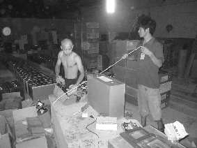 16日,临沂市质监局稽查局接群众举报,有人涉嫌伪造厂名、厂址生产多功能音响。记者陪同执法人员于16时赶至现场,看到6名工人正在一民房内紧张操作。电线、螺丝钉、焊机等组装件和工具被分别置放在两个搭起的工作台上,四五平方米的“生产车间”几乎难以落脚,现场一片混乱。
