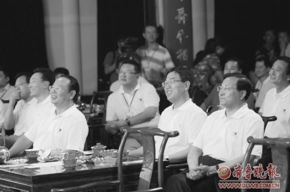 8月13日晚,参加完好客山东休闲汇启动仪式的部分领导与游客、市民一起,步行至明湖居观看山东传统曲艺表演。