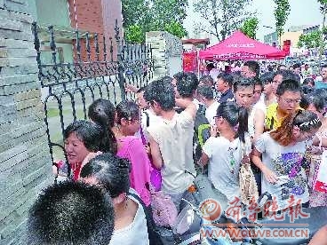 17日,历下区事业单位招聘报名第一天,报名队伍排起了长龙,图为场外的应聘者正在争领报名号。