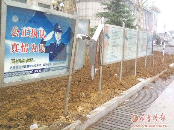 16日上午,记者在泰山火车站广场出站口看到,一处形象宣传牌的玻璃被打碎,与之相连的牌子也已经严重变形。