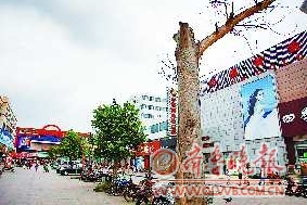 17日上午10点,记者赶到王先生所说的太阳城市场南门附近的商业街。这条长一百多米的商业街上,种植了12棵法国梧桐树,其中有4棵已经死亡。最明显的一颗比其它的明显要粗,这棵树已经没有了树皮,树干上钉着三颗长钉,还贴了小广告。几棵死去的梧桐树顶都是光秃秃的,只有几枝枝桠。