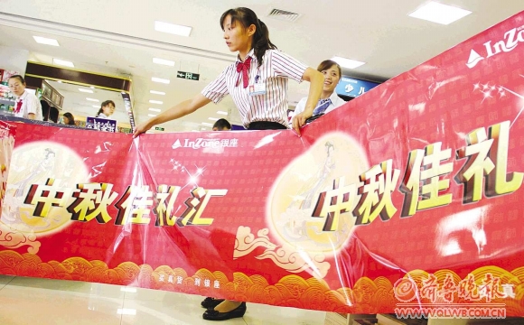 17日,距离“中秋节”还有二十多天,但商家们已开始用海报装扮橱窗和销售专柜。图为银座商城东岳店的工作人员正在布置“中秋节”宣传条幅。