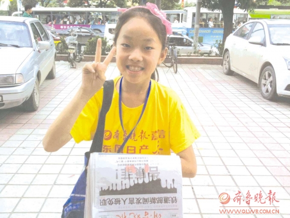 17日早上7点左右,记者在银座商城东岳店附近看到,10岁的侯文佳挎着蓝色书包,手里拿着报纸从肯德基店出来。旁边没有父母的看护和指导,侯文佳显出孩子的天性,看着有人经过,她就蹦蹦跳跳地跑过去询问一番。如果对方买了报纸,她会礼貌地说声谢谢,即使被拒绝也不沮丧,依然说声谢谢。