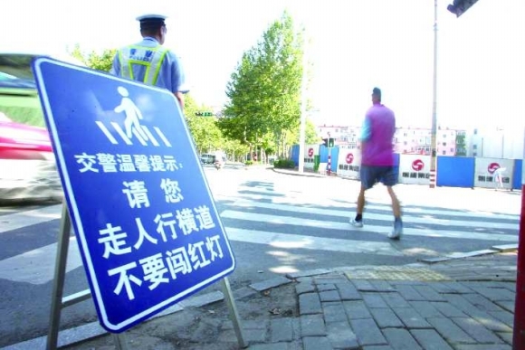 17日,在市区南迎祥路与环山路十字路口,一位行人匆匆走过。据交警一大队民警介绍,17日起,市区主要路口都安置了醒目的文明交通提示牌,提示行人在过马路时遵守交通规则,机动车、行人都各行其道,保障路口畅通,创造文明和谐的交通环境。