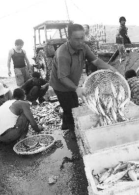 距该院落大约200米的另一处院子里,也是忙得不可开交。记者看到一辆满载鲅鱼的船刚被拖拉机从海中拉出,放在了院子门口处,两位年轻小伙子用网兜把这些鲅鱼一一从船上取出,扔在湿漉漉的地面上,几位渔民忙着进行分类挑拣,不一会八九个塑料箱盛满了大大小小的鲅鱼。据该捕捞户介绍,小鲅鱼零售2.5元一斤,如果批发能便宜些,每斤2.2元,马步鱼每斤10元。