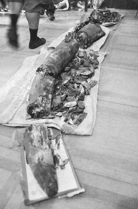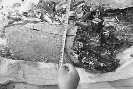 解学涛家堂屋正中地上一溜儿三个编织袋, 宝贝”安稳地躺在上面。远观,黑乎乎的,好似一段分成四截的朽木,颇有几分象牙的模样。其中最边上一个编织袋上散乱的一堆则像一堆黑色的乱石。近看, 宝贝”表面沾满了泥沙,散开的部分好似燃烧过后的木炭。