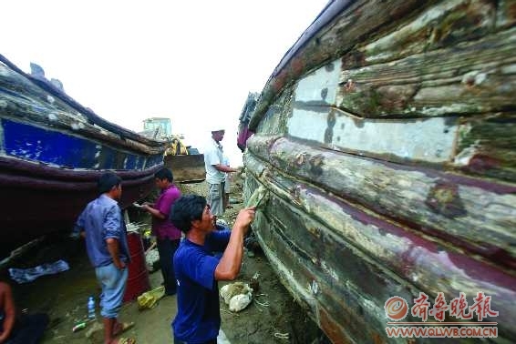 16日,在沙子口南姜码头,处在休渔期的渔民正在修补渔船,准备在9月1日出海打渔。渔民毛先生告诉记者,距离开海打渔还有半个月时间,渔民已经开始为捕鱼做好准备。 本报记者 杨宁 摄影报道