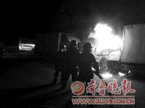 着火现场,厢式货车车头浓烟滚滚,受高温炙烤,另一辆与它对头而停的货车车头已经变形,如不及时控制火势,油箱一旦爆炸后果将不堪设想。消防队员立即用高压水枪对油箱降温,经过一个小时的紧张扑救,大火被扑灭。