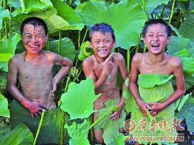 暑假是孩子们尤其是农村的孩子们最喜欢的假期。在成武县成武镇郜鼎集村,三个可爱的小朋友在荷叶遮挡下合影留念,做调皮状,十分可爱。