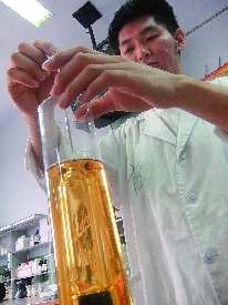 据了解,啤酒的酒精度以常温20℃时的度数为主,所以实验室工作人员对这两种扎啤进行了短暂加温处理,使扎啤达到20℃时便用酒精计进行检测。在经过一系列准备和实验后,最终检测出烟台啤酒的酒精度为3.1度,而没有任何身份标志的那份扎啤酒精度为2.8度。