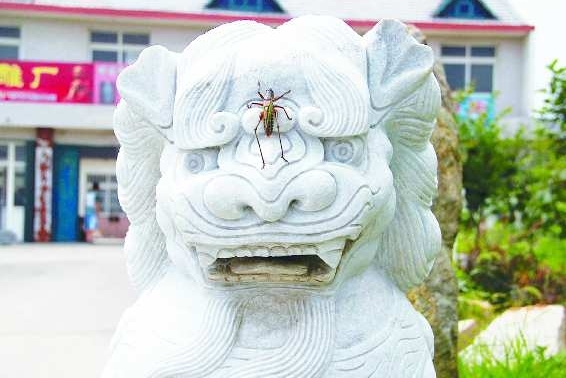 作品描述:一只蝈蝈爬到石狮的眉间处,石狮子非常恼火,却又无可奈何。