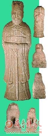 两件石羊,一件长1.18米,另一件略小,“俩羊”作卧俯状,抬头远眺,双角后卷,身体肥硕,颀长圆润,四肢轮廓清晰,整体比例准确,有雍容大方之气。两件石兽,虽然并不能确定是什么兽类,但是看起来综合了虎狮豹之类猛兽的特征,作蹲伏状,背拱起,昂首远眺,前趾撑地,蹲坐于基座上,双眼正视前方,神态威猛。这组石人、石羊、石兽,均由整石雕成,从艺术手法上称得上是珍品。