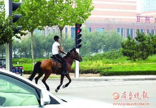 8月18日下午,一名马术爱好者在烟台路上骑着高头大马。据了解,现行交通法规中没有禁止市民骑马上路的规定,但鉴于骑马可能对行人安全与道路交通秩序造成影响,交警部门不提倡市民骑马上路。