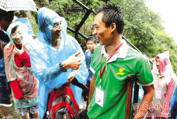 18日,来自聊城的28岁残疾人刘学长,用一条腿、一根拐,冒雨爬上了泰山。看到刘学长坚强的身影,游客对他竖起了大拇指:“年轻人,好样的!”本报记者 刘丽 摄