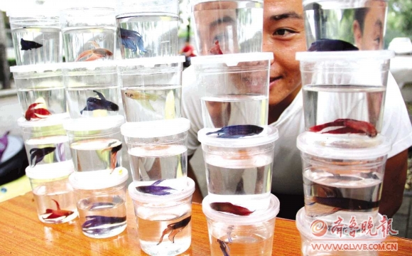 16日,一种颜色五彩斑斓的热带斗鱼在奈河西路出售,吸引了不少市民。这种斗鱼性子很烈,以好斗闻名,而且一打架就将美丽的尾巴张开,像孔雀开屏一样。商家为避免斗鱼争斗,伤害鱼尾,只能隔离饲养。