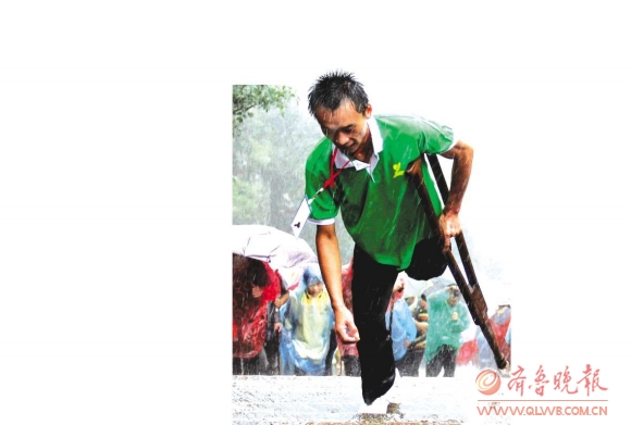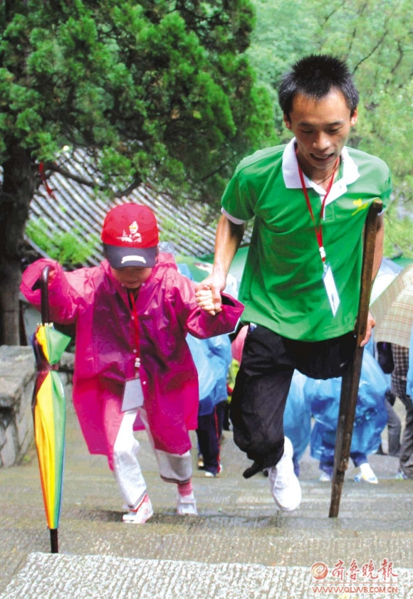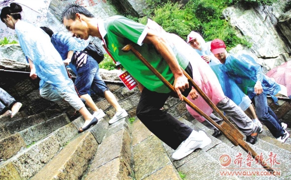 18日,泰山迎来了70多名残疾游客,在这些人当中,来自聊城的28岁残疾人刘学长,冒着山雨,用一条腿、一根拐,经过2个多小时的努力,从中天门爬到泰山极顶。一路上,他用坚强,获得了小朋友的崇拜;用毅力,获得了成年人的钦佩;用笑容告诉人们,残疾人也可以成为生活的强者。