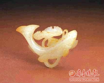 玉色白,表面有赭黄色斑。鱼小头,长身,无鳞,鱼身弯成弧状,昂首,尾上翘,鳍短而厚,共6片,其上有细阴线。鱼身旁伴一荷叶,长梗弯曲,盘而成环,可供穿系绳。西周以后鱼类玉器数量锐减,唐代又有回复,宋代佩鱼之风又盛,出现了较多的玉鱼,样式、种类不一,或与荷莲、茨菇相伴,或仅单条鱼,或无鳞,或饰横向水线,或饰网格纹。此风一直延续到元、明、清时期。荷花与鱼相并含有连年有余之意,是吉祥图案的一种。