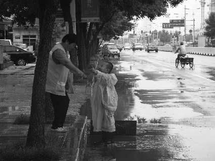 18日上午11时许,记者途经黄河五路时看到,雨后一小男孩正拿着工具帮一位环卫工清理路边积水。据了解,这个小男孩是附近一家眼镜店工作人员的孩子,今年7岁,刚上一年级,“小家伙儿非要帮我干活,拦都拦不住。”旁边的环卫工说。                             见习记者 侯晓 摄影报道