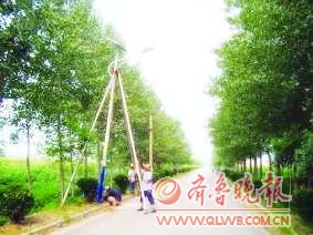 为倡导低碳、环保、绿色、节能新理念,近日,滕州市洪绪镇6个村级单位安装了308盏,居民太阳能热水器普及率达95%,条件较好的村居还用上了清洁卫生的沼气和管道天然气。图为工人正在安装太阳能路灯。