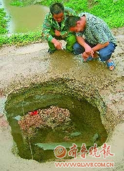 右图:村民对出现的大坑束手无策。