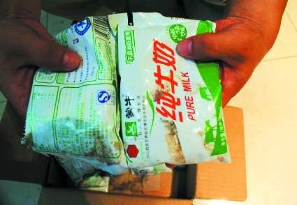 18日上午9时,记者来到市区冠蒙时代花园刘先生的家。刘先生从餐厅里搬出一箱蒙牛纯牛奶,打开箱子,明显闻到一股异味,有几袋牛奶包装上还有异物,箱子底部也出现了阴湿、发潮的现象,箱子底还有一个空牛奶袋。