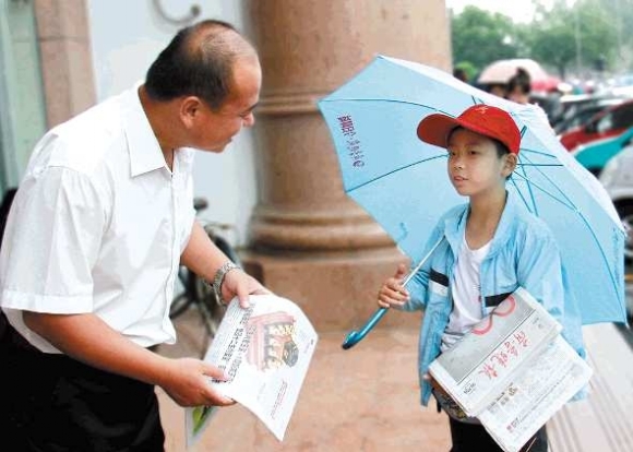 18日,市区下起小雨,但没有影响小选手的热情。图为俞道龙在百货大楼附近雨中卖报。